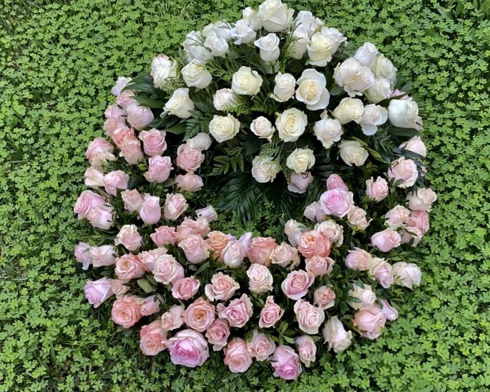 Corona de rosas de dos colores, aro realizado en diferente color al cabezal. Incluye cinta de condolencias y podemos modificar el color de la misma